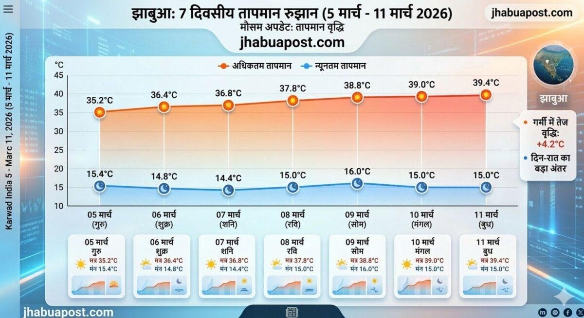 अगर हम पिछले 7 दिनों के मौसम के आंकड़ों को देखें, तो पता चलता है कि गर्मी किस रफ्तार से बढ़ रही है। 5 मार्च को दिन का अधिकतम तापमान 35.2 डिग्री था, जो 11 मार्च आते-आते 39.4 डिग्री तक पहुंच गया। यानी सिर्फ एक हफ्ते के अंदर ही दिन की गर्मी में 4 डिग्री से ज्यादा का इजाफा हो गया है।
