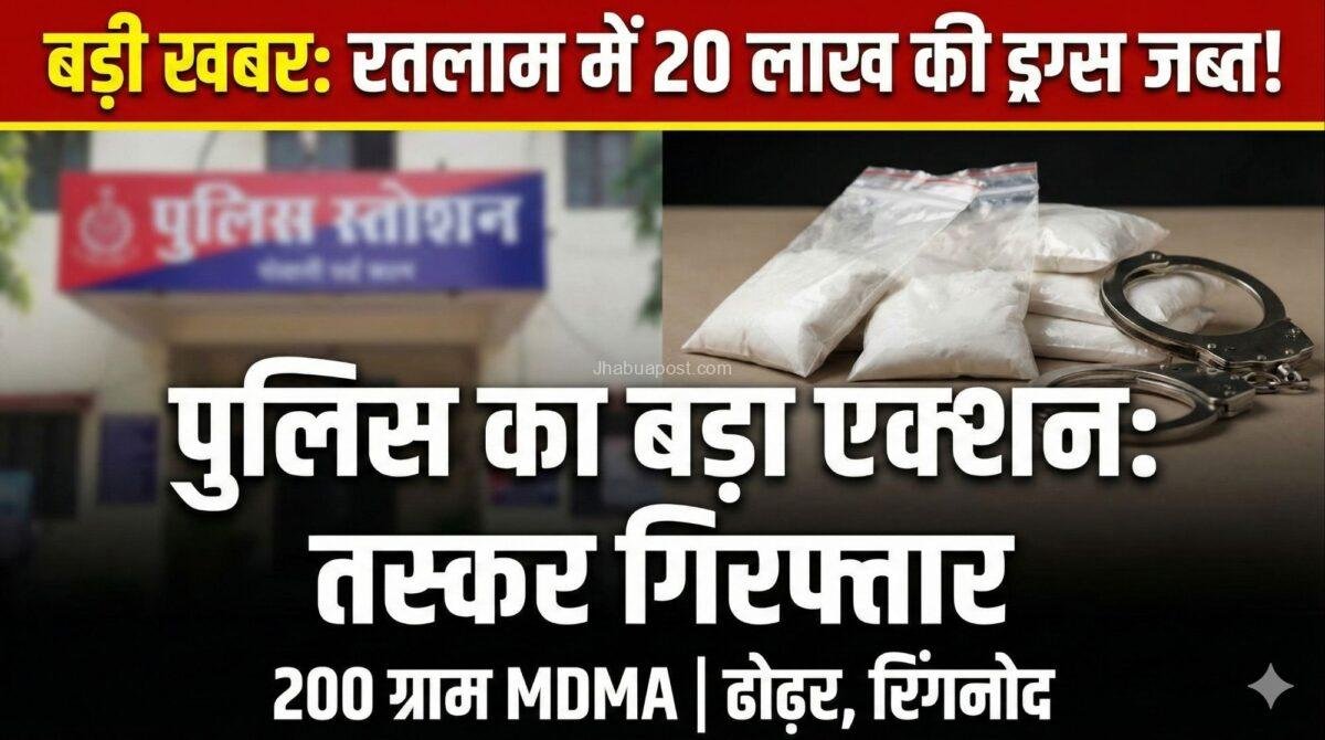 रतलाम । पुलिस अधीक्षक अमित कुमार के निर्देश पर जिले में ‘नशा मुक्ति’ अभियान के तहत पुलिस को एक बड़ी सफलता हाथ लगी है। रिंगनोद थाना अंतर्गत आने वाली ढोढर चौकी पुलिस ने 20 लाख रुपये की अवैध मादक पदार्थ (MDMA ड्रग्स) के साथ एक तस्कर को गिरफ्तार किया है।